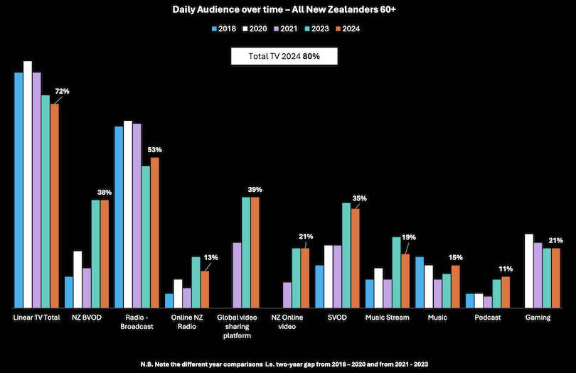 Of course they aren’t truly alike. Younger New Zealanders are much more likely to watch social video, SVOD, do online gaming, stream music and listen to podcasts. Older New Zealanders are more likely to watch linear TV, listen to broadcast radio and – this is interesting, and very challenging for funders – watch New Zealand TV on demand, like TVNZ+ and ThreeNow.