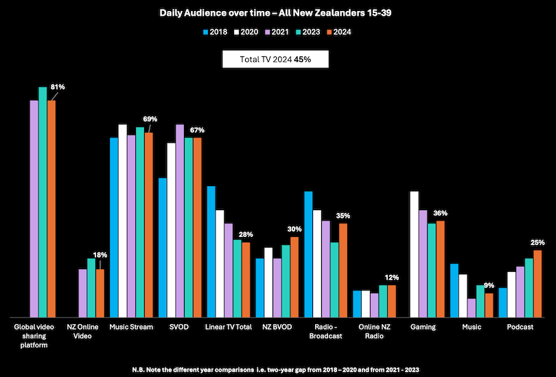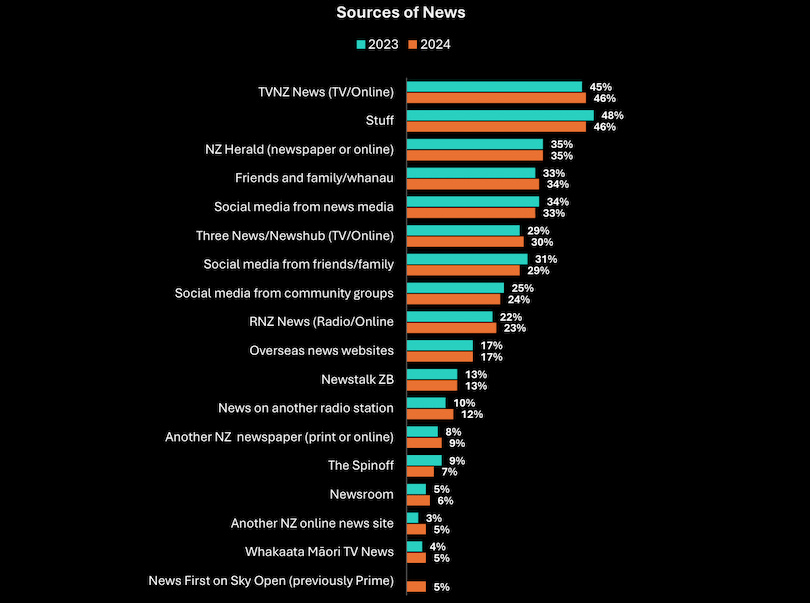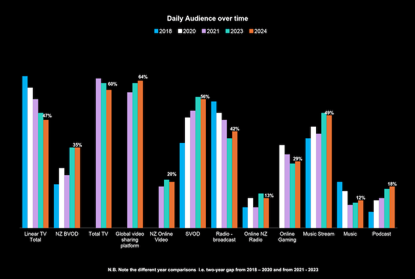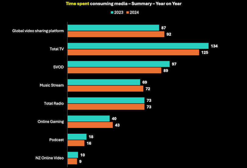 It’s easy to make fun of radio, with its surveys that magically show a tiny bit of growth every single time – especially given that Where Are the Audiences tends to show the opposite. However in 2024, the great cockroach of media defied all obituaries by showing healthy growth. There is a slight mystery here, given that total time spent listening is dead flat (some other trends, like ZB moving past RNZ, are present in both WATA and radio’s own surveys). Either way, given that so many are steady or backwards, radio has every reason to be thrilled with this result. / DG