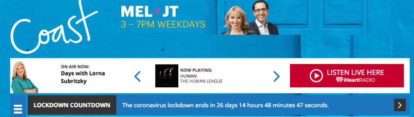 Old mate Jase was on the phone with the prime minister and explaining that he has to come into work through two special doors to get into NZME, “gloves in the elevator, all that stuff” – all that stuff! How quickly things change! Concerningly, Jase also says that he is broadcasting in his pyjamas, which is kind of fitting with the apocalyptic countdown timer to the end of lockdown on the Coast website, ticking right down to the final SECOND?! Luvvit. / AC