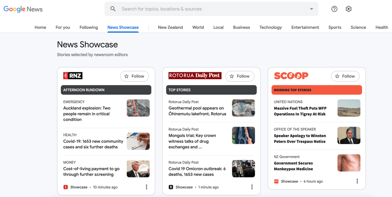 Google News Showcase, a new product from one of the world’s largest companies, launched in Aotearoa last week. Its arrival felt somewhat muted, limited to a smattering of low-prominence news stories. Finding it is an effort – it’s the the fourth-ranked option in its news sidebar. In a blog post accompanying the announcement, Google said News Showcase exists to “continue our support of New Zealand’s vibrant and diverse news industry to help people find quality journalism and contribute to the sustainability of news organisations”.