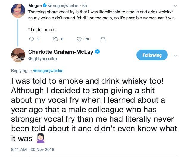 I’ve gotten a few vocal fry complaints over the years. It was always men and by the second para they’d usually have moved onto a few *other* reasons why they objected to hearing a young(er) woman on the radio. Never heard of one male colleague getting anything similar.