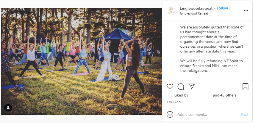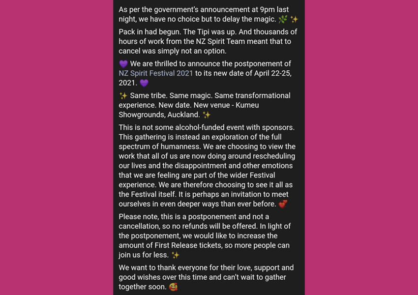 Set to take place this week in Auckland, NZ Spirit Festival promised four days of live musical performances, interactions with “healers” and workshops on everything from meditation and yoga to hair brushing and cuddling. When the Auckland lockdown was announced on Saturday, it was immediately clear the festival could no longer go ahead as planned. On Sunday, organisers took to social media to announce their plans: a new date had been secured for April, but: “This is a postponement and not a cancellation, so no refunds will be offered”.