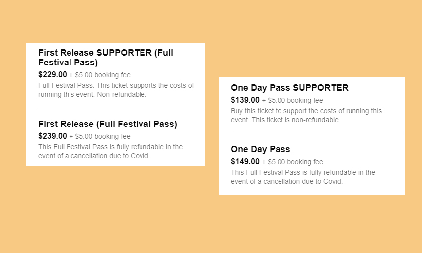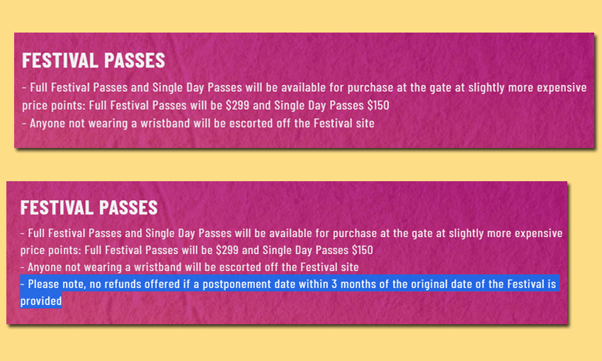 One of these “fully refundable” ticket holders, Sian O’Gorman, says she bought three one-day passes for herself and two friends for $149 each (an additional $30 carpark pass and $5 booking fee for each ticket were also required upon purchase). While “supporter” passes cost $139 each, the tickets were described as “non-refundable”, which prompted O’Gorman to purchase the slightly more expensive option.
