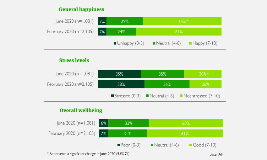 Then when the survey was conducted again in June following the Covid-19 lockdown, those who felt they were either just managing to get by or struggling to make ends meet had increased from 31% to 33%. Those who said they were unhappy or had poor overall wellbeing also increased from 24% to 29%, and 31% to 33% respectively (although interestingly, fewer people said they felt stressed in June, which could come down to the effective health response and the waning threat of Covid-19 in New Zealand).