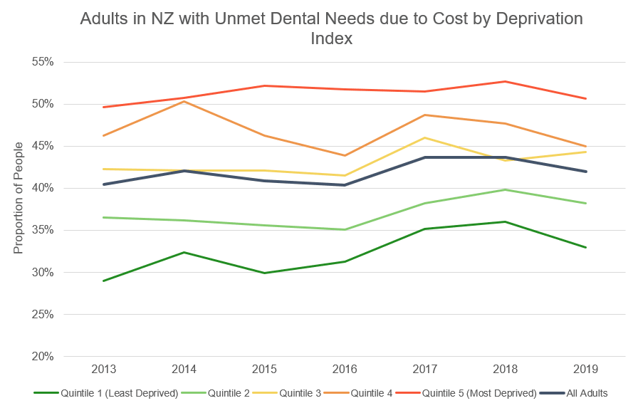 In 2019, 42% of adults across New Zealand had an unmet need for dental care due to cost. More surprising, however, is that among the least deprived 20% of the country, a staggering one in three people did not go to the dentist because of cost. At the other end of the spectrum, among the most deprived New Zealanders, 51% needed to see a dentist but did not do so because of cost. These numbers have held steady or even increased slightly since 2013.