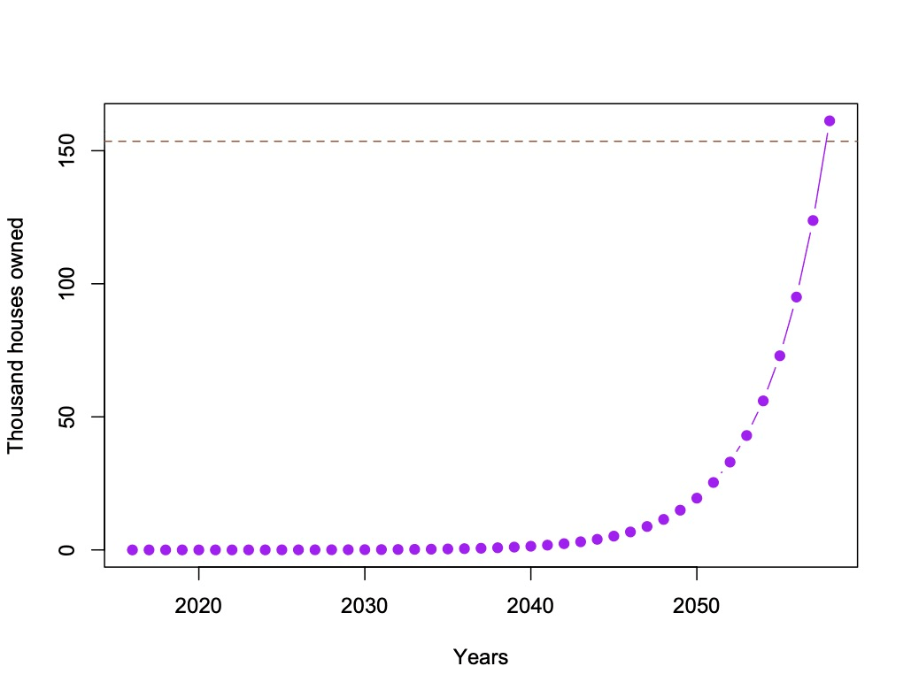 However, Lumley does take issue with the premise of using 2020 as year zero of the Meredith era. He has created a separate model starting in the year 2016, when she bought her first property, and inserted the actual data on her property acquisitions. Lumley then uses “R” to fit a “Poisson regression model”, and concludes Meredith’s house stock will increase 30.26% per year. “We get to total Christchurch ownership late in 2058,” he says.