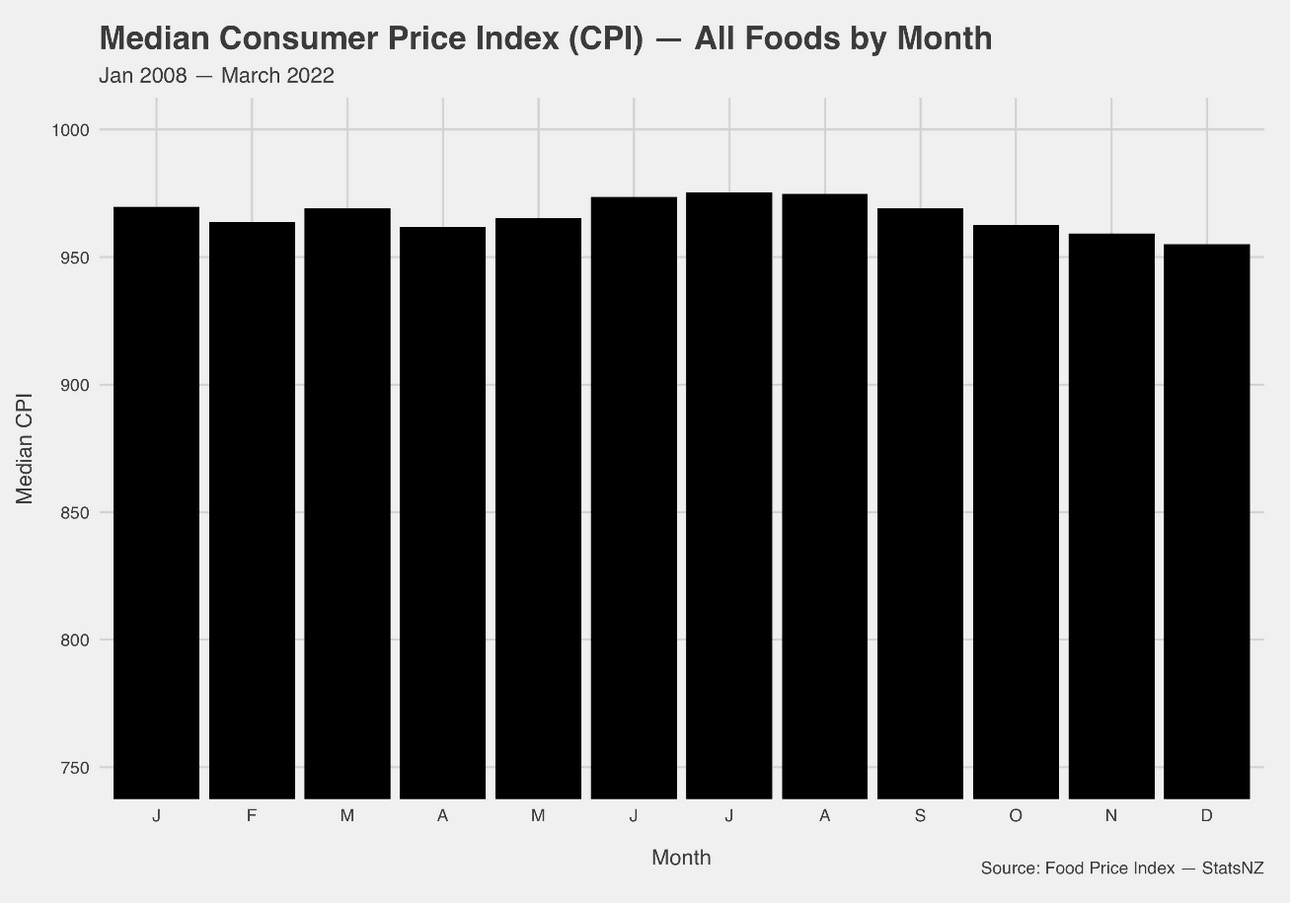 This data is what we’d expect for vegetables that grow better in the colder months: higher supply leads to lower prices. The timing of the freeze means these vegetables have been frozen at the higher May price, and so they won’t decrease like they usually do*. Countdown’s freeze might therefore keep prices of carrots, onions, and pumpkins artificially high – meaning that from June to August, consumers could possibly be worse off when buying these veges at Countdown than they would be without the freeze.