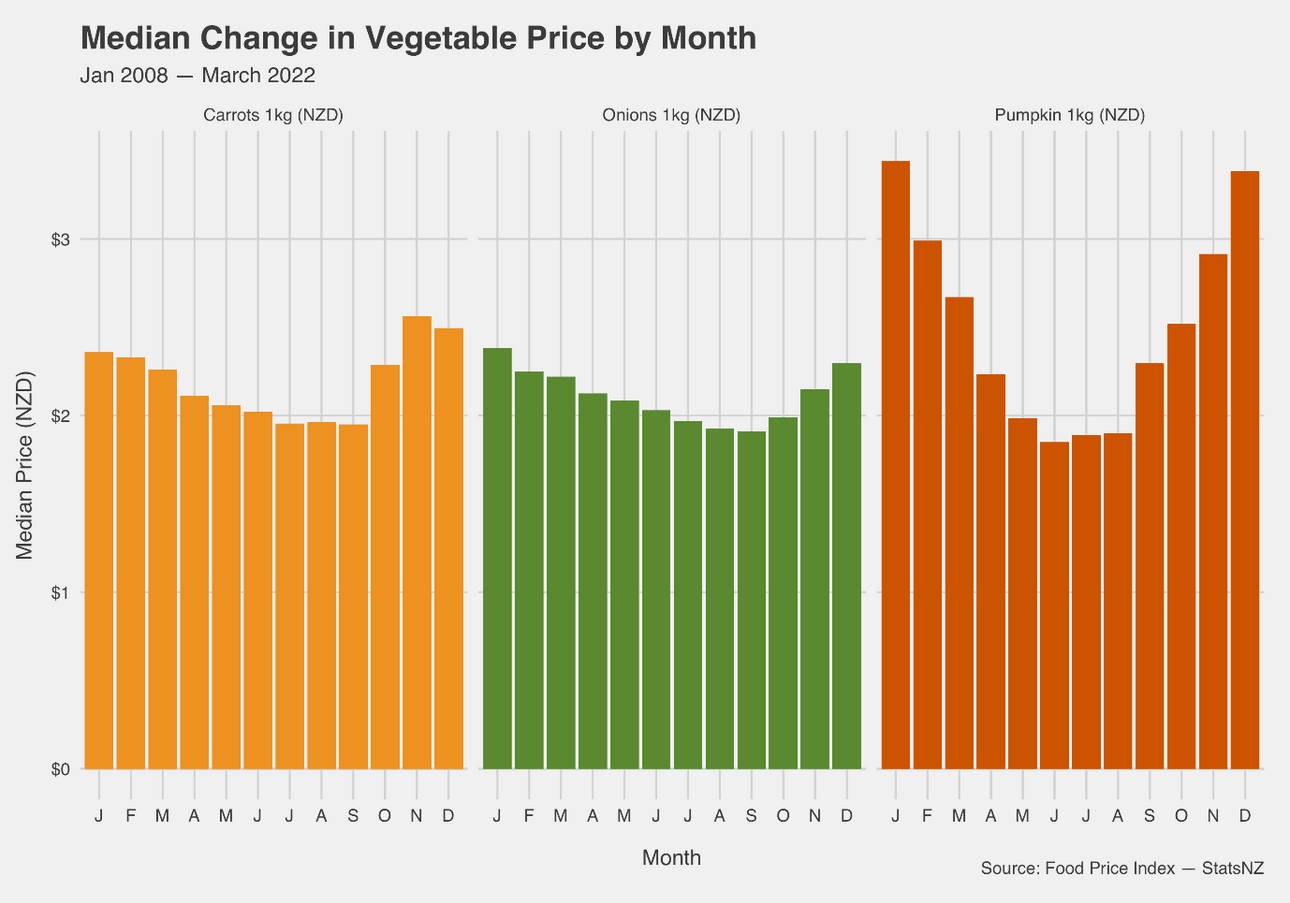 Stats NZ data shows carrots, onions, and pumpkins usually go down in price in winter, before rising again in summer.