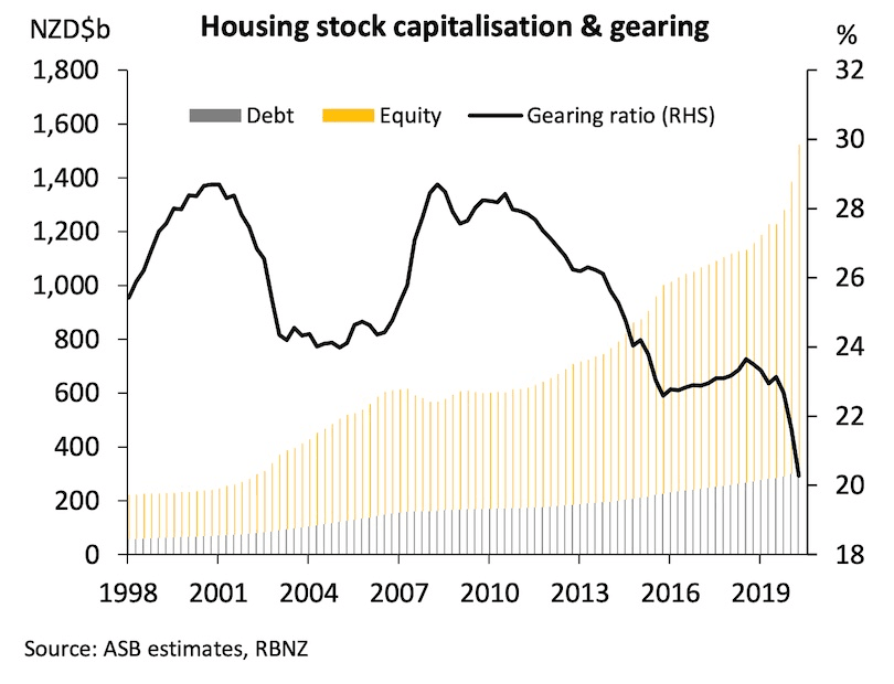On the home equity front, there is also no burning platform. Only the most recent buyers in the last six months or so would have less than 20% equity, and even then that risk for a few is quickly dissolving as prices keep rising. Banks have wound back their lending above 80% dramatically since the introduction of LVR controls in 2013. The collective LVR of the housing market is barely 20%, as this ASB chart shows.