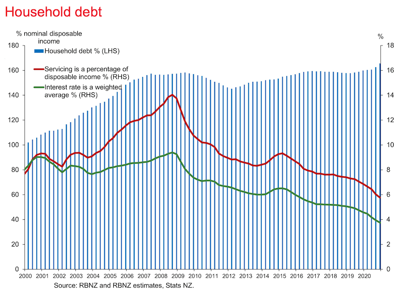 Borrowers currently pay around 6% of their disposable income to service their loans and a doubling would still leave that percentage well below the peak of servicing costs seen in 2008 and 2009, when interest rates rose over 10%. The below Reserve Bank chart shows this, with the red line being the servicing costs.