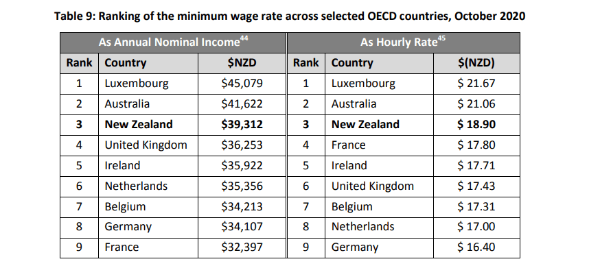 In a global context, New Zealand’s minimum wage as of last year ($18.90 per hour) was the third highest among OECD countries behind Australia ($21.06 per hour) and Luxembourg ($21.67 per hour) but ahead of countries like the UK, Ireland, Germany and France.