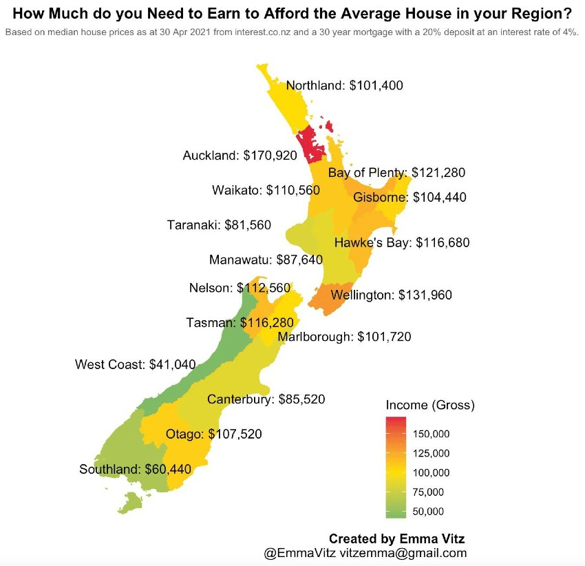 From the comfort of my 23 square metre apartment that I most definitely do not own, I mapped out the New Zealand property market. I took the common financial advice to not spend more than 30% of your gross weekly income on housing and calculated the household income needed to make this possible for a homeowner in each region of the country.