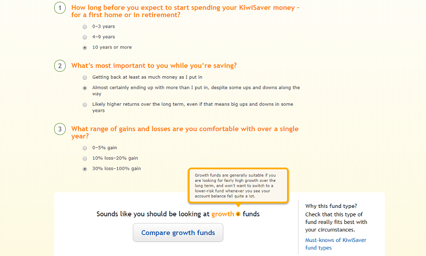 The easiest way to figure out the type of fund you want is to use an online tool like the KiwiSaver Fund Finder which asks: a) when you expect to start spending your KiwiSaver money, b) what’s most important to you while you’re saving, and c) the range of gains vs. losses you’d be comfortable with over a single year. For example, my answers show that I should be looking at growth funds which are designed for those looking for “fairly high growth over the long term” and are “intending to leave [their] money in KiwiSaver for at least 10 years”.