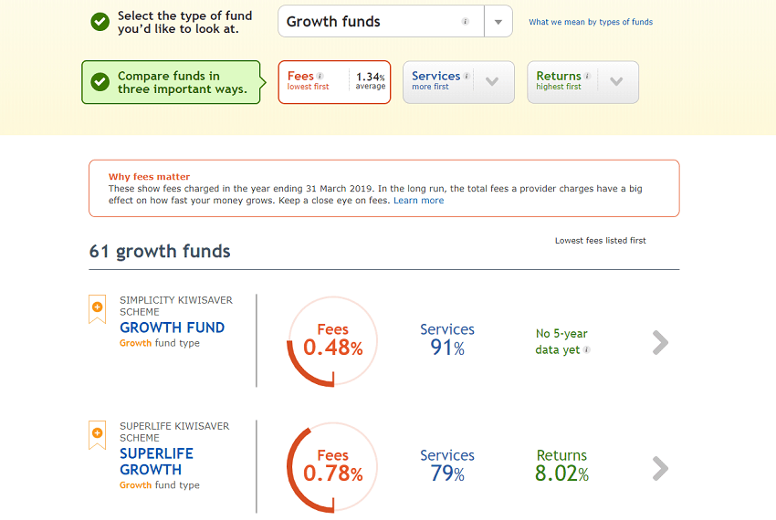 With KiwiSaver Fund Finder you can use the compare funds tool to find the fund that has the lowest fees, the most services and the highest historic returns. Take growth funds, for example, of which there are more than 60 on offer. If I wanted the lowest fees possible, the tool shows that I should opt for Simplicity’s Growth Fund (0.48%), for the most services I should opt for one of several on offer by NZ Funds, and if I wanted the highest returns (based on historic data since future returns aren’t guaranteed) I should opt for QuayStreet’s Equity Fund (14.25%) instead.