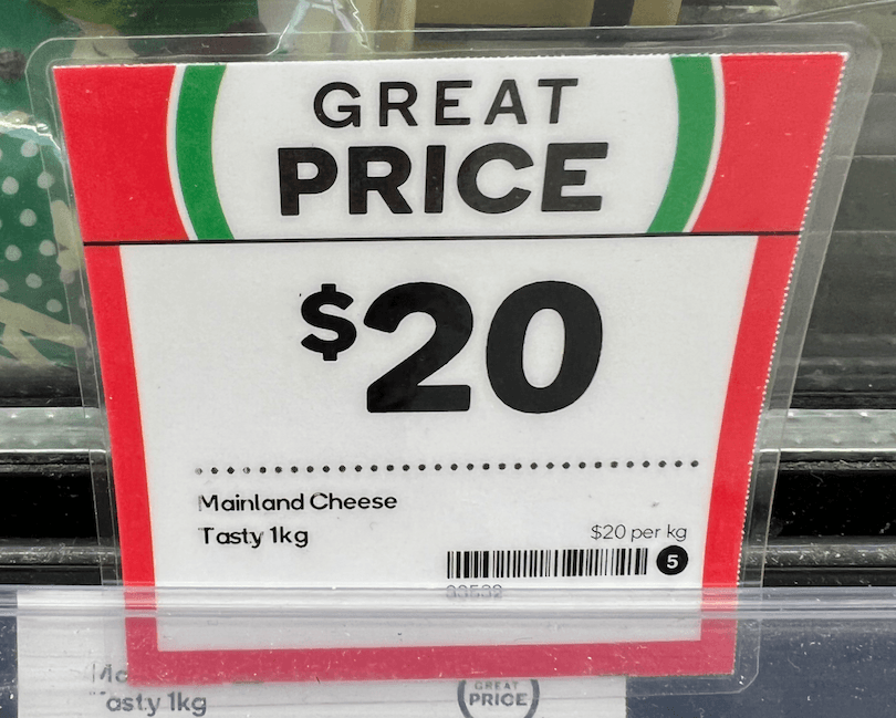 Bucking the fortnightly trend is Mainland Tasty. Unsullied by cheap tricks, the bougie paragon of cheeses never budges from the perfectly round price of 20 dollars and zero cents per kilogram. A price that one supermarket steadfastly claims is “great”:
