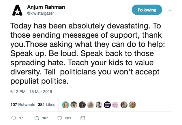 The Aotearoa Resettled Community Coalition has set up a number of support lines run by multilingual volunteers in Christchurch. You can find them all here. “The events of today in Christchurch are distressing,” wrote the Canterbury District Health Board on Facebook. “If you or someone you know needs mental wellbeing support or advice then call or text 1737 any time day or night to talk to a trained counsellor.” This page has also been set up to republish messages of support for the Muslim community in New Zealand.
