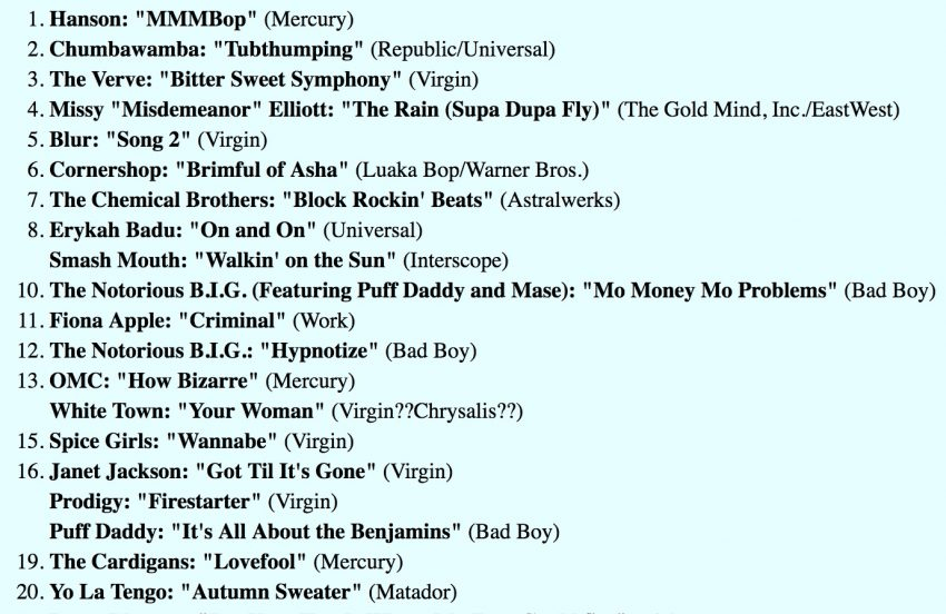 Basically, it’s the complete opposite of another monster hit from that year, and the second most-voted song on our poll, ‘MMMBop’ by the then 11-, 13-, and 16-year-old Oklahoman brothers Hanson. ‘MMBop’ sounds like a white version of Jackson 5 mixed with the Beach Boys and, perhaps due to the production of the Dust Brothers, a tween-friendly Beck. In fact, except for the record scratches (which are due for a comeback BTW), ‘MMMBop’ sounds strangely fresh, even though upbeat happy music is officially out of fashion and out of the charts. Also surprising is that ‘MMMBop’ was not only a commercial hit (it topped the charts in 14 countries, including New Zealand) but also a critical triumph, topping the most prestigious end-of-year poll (until the mid-00s at least) the Village Voice’s Pazz & Jop poll. Number two, by the way, was ‘Tubthumping’.