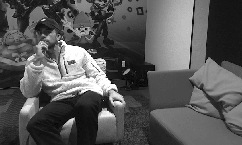 Both parents and two sisters are teachers so while he imagined it wasn’t a path he would take, before music became his main gig, fate led him to working part time as a kaiako at Unitec, teaching kura pō te reo Māori. “That’s not something I thought I’d ever do,” he says, settling into an oversized lounge chair with a Sony Playstation sign looming behind him. “I was always quite reluctant to go into education because of my family. It worked out really well, having a part time job while I was trying to do music. And it was nice being immersed in the culture and language. It’s not something I’ve had since moving away from home. You don’t want to lose that part of yourself.”