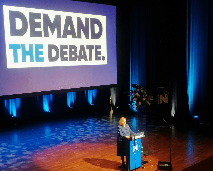 With every burst of applause during Judith Collins’ closing address at the National Party conference yesterday, the screen above her lit up in giant type, DEMAND THE DEBATE. I began to think of it as a kind of clapometer. A demandometer. A debatometer. Did the members of the National Party, packed in their hundreds into the Vodafone Events Centre in Manukau, think a particular line was punchy enough? DEMAND THE DEBATE. Did a subject fire them up? DEMAND THE DEBATE. Did they consider an eyebrow-raising quip witty enough? DEMAND THE DEBATE.