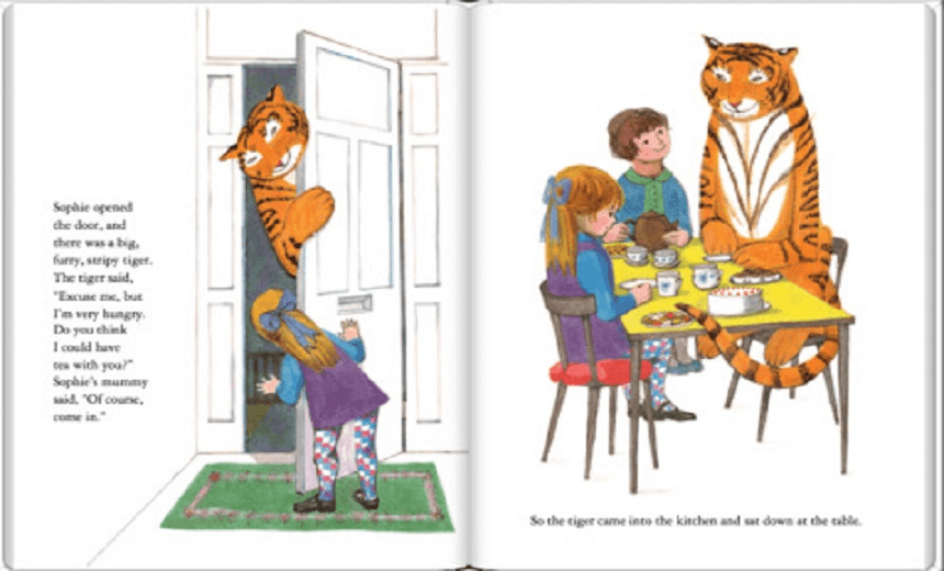 So Sophie’s mummy said, in a parched whisper, “Would you like a drink?” And the tiger drank all the milk in the milk jug and all the tea in the teapot, without having any consideration for those who were serving him.