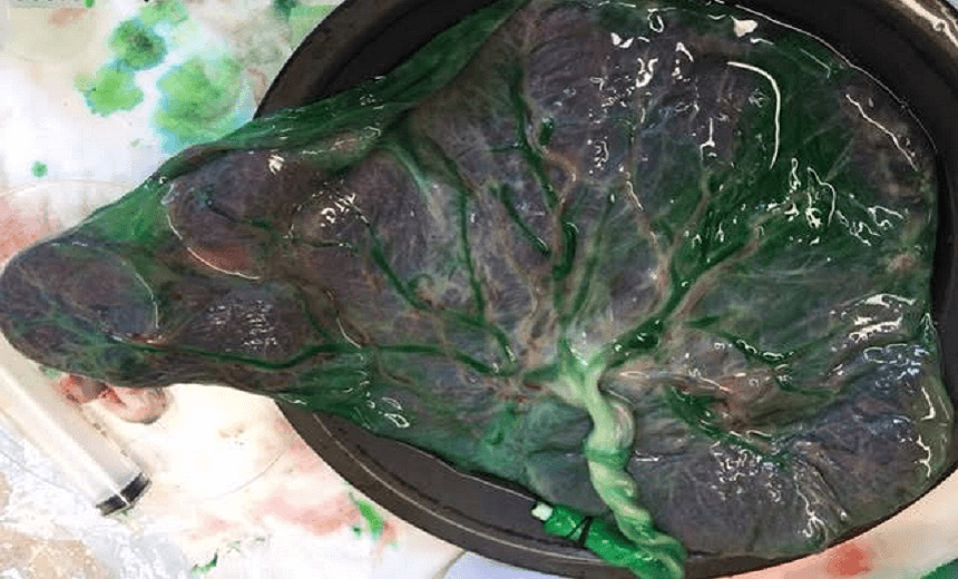 Then after that she passed it onto one of my other PhD students, Win Tun, who is the one who injected all that dye into the vessels on the back of the placenta that you can see in that picture [below]. Win works on a project run by me and Dr Alys Clark of the Auckland Bioengineering Institute, which uses a combination of real anatomical inputs and computational models to look at how the structure of blood vessels in the placenta affect its function.