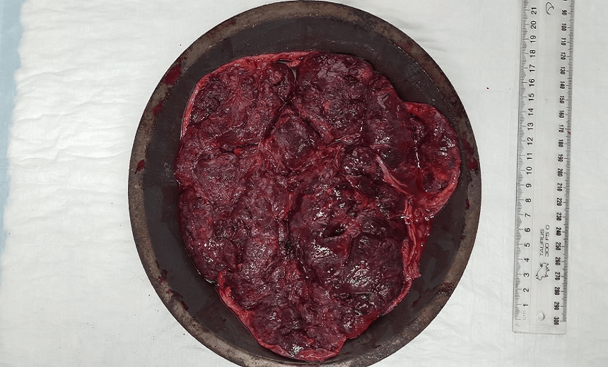 It’s usually about half a kilogram in weight, so it’s a pretty solid guy. Placentas from babies with growth-restriction tend to be smaller, so they’re often 250 grams. Normal placentas are around 400 to 500 grams. It’s probably the size of a small dinner plate and 2.5cm thick.