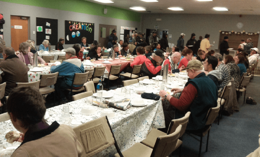 Growing numbers of New Zealanders frequently have no choice but to rely on the charity of others to eat [PDF]. Charitable food provisions such as foodbanks typically offer limited food choices to people in need. The commonly accepted proviso is that beggars can’t be choosers. Lea survives thanks to a local charitable meal (pictured below). She walks 45 minutes (each way) to access what is often her only ‘proper’ meal each day. The community meal offers more than just food. It provides an inclusive community space for otherwise excluded people. The creation of a welcoming space provides the opportunity for people such as Lea to engage in positive social interaction over a hot, filling meal. Humanising spaces such as the meal help to alleviate the social isolation experienced by low-income families alongside hunger and food insecurity.