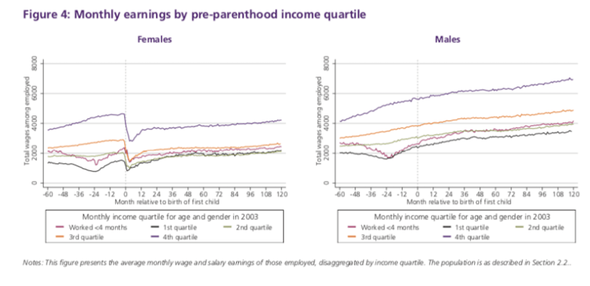 Because few men are the primary caregivers it is difficult to compare and contrast the earnings of men and women who do most of the parenting. However, even for women who are highly paid and return very quickly to work after having a baby (ie their work patterns looks more like men) earnings fall with becoming a parent and don’t catch up.  Males’ working in the same bracket (the purple line) continue to growth smoothly over time after they become parents. Their monthly incomes pull further ahead of mothers.