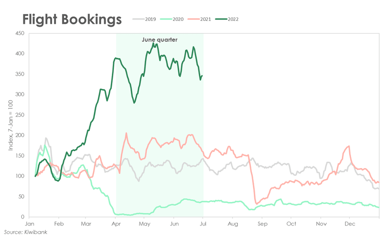 Covid-19 continues to offer an explanation for this rebound – Kiwibank electronic card spend rose 7.1% in the June quarter, bouncing back from the 9% drop in the omicron-riddled March quarter. The rebound was supported by Aotearoa moving into the orange setting of the Covid traffic light system in April, just in time for the mid-year run of public holidays, which this year included Matariki for the first time. As a result, restaurant spending rose 16%, spending on hotels and accommodation increased by nearly a quarter and money spent at the movies and on events rose by the same amount.