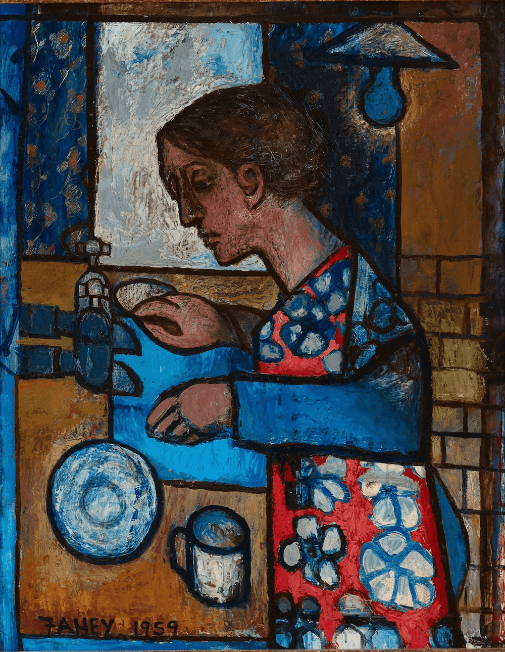 Not this one. Touted as the first overtly feminist painting in Aotearoa, Woman at the Sink is as dour and static as Fahey’s later works are riotous and alive. Made of geometric shapes with thick black outlines, it invokes a sense of drudgery, sluggishness and isolation: here is a woman trapped at the sink, trapped in the suburbs, unpaid and unrecognised for her labour.
