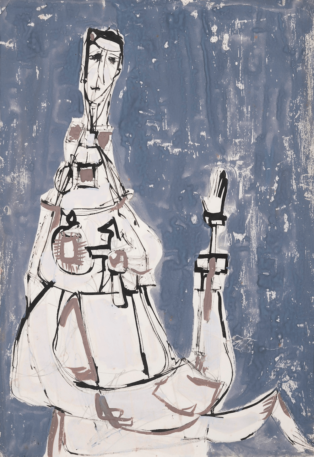Undoubtedly my favourite discovery of this exhibition is June Black. Her works are undeniably strange: they’re spindly characters with haunted expressions, elongated ceramic figures built from textured segments of clay, adorned with various objects and medallions, each glazed a different colour: pocket watches, a three-leaf clover, a sun, a chain. When they were first exhibited in 1958, each painted character was paired with its ceramic counterpart, as well as a short script detailing their name, role and a pithy “mission statement”.