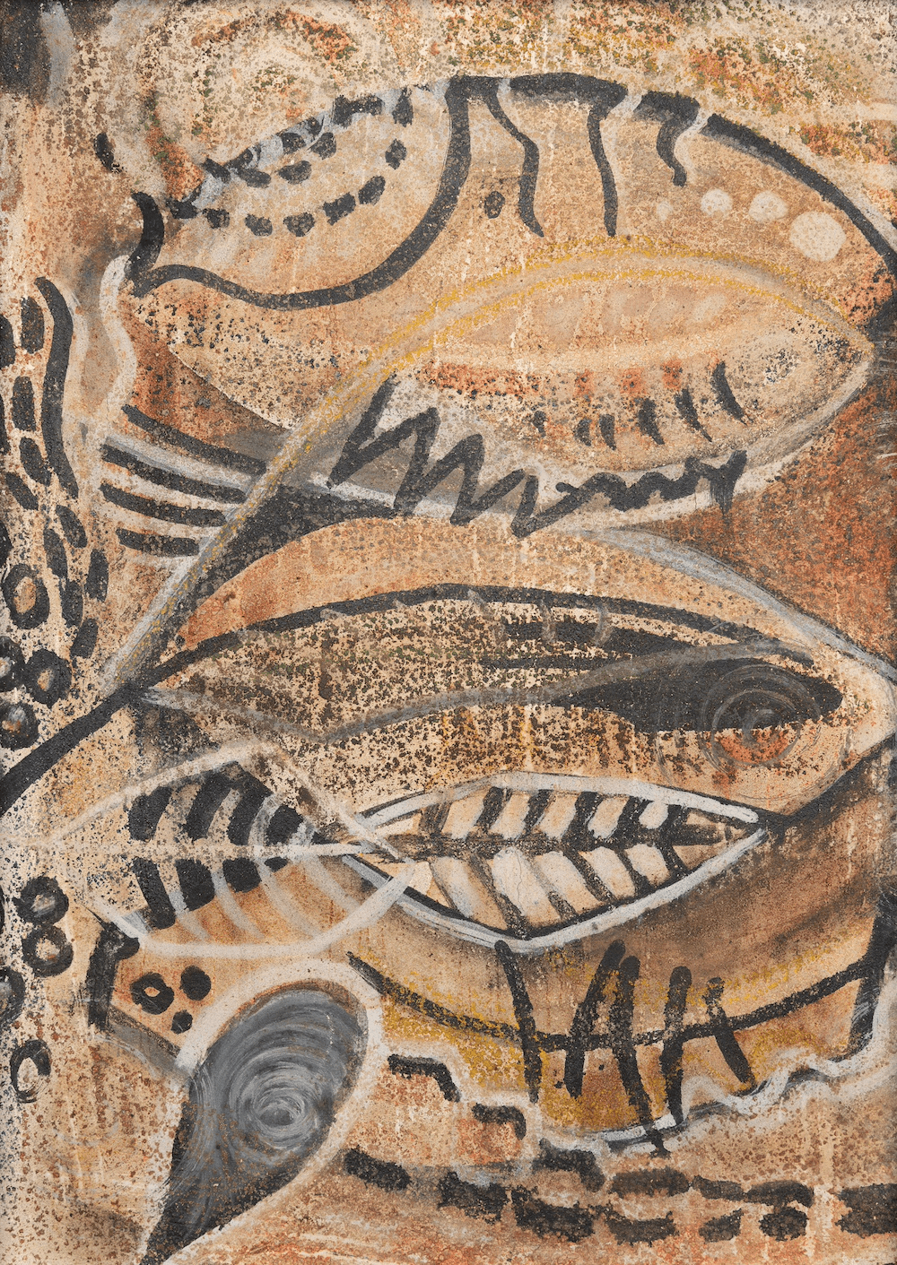 While Dame Kāterina Mataira is best known for her pivotal role in promoting and revitalising te reo Māori, before the 1970s she is also recognised as one of the first Māori modernists; she was the only wāhine artist included in the inaugural exhibition of modern Māori art in 1958. Her painting Deep Water demonstrates her skill with mixed media, using different textures to build a sensuous, layered painting evocative of the sea despite its earthy colour palette. Abstract marks swim and coalesce to form fish, streams of bubbles, kaimoana and swirls of light and sand.
