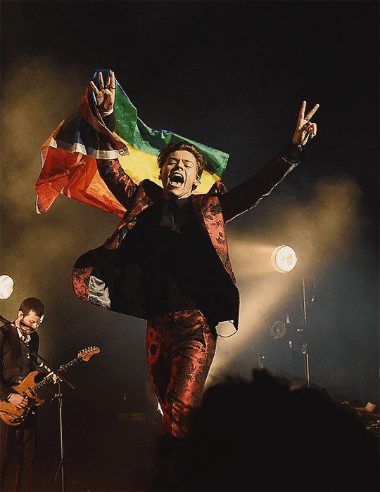 At the first gigs, Harry takes a pride flag from someone in the audience each night and dances around with it for a bit before looping it on his mic stand while he sings.