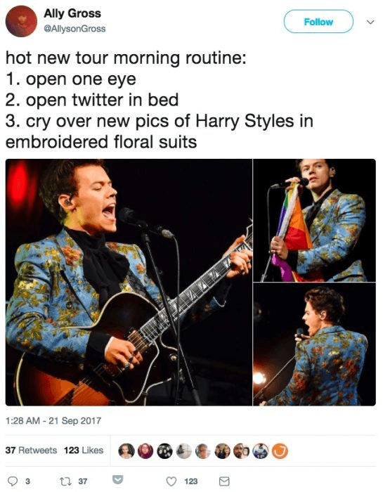 Some of my ‘real’ friends continue to tease me – sending me links to pictures of Harry performing and concert reviews. Others have fallen firmly down the rabbit hole themselves. I get a text from one who barely knew what One Direction was when I first gave my talk: “I think he is in the zone with this show. He had a more natural ease. Like any jitters were gone. This frightens me because basically? I have watched every available Harry vid on Instagram.” I mean, you’re welcome.