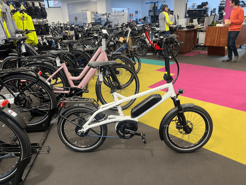 The first ebike Wells selects for me to try is small-ish and white. Before learning all about this topic I would’ve described this bike as “foldy” and maybe a little weird. But it’s a Riese and Müller Tinker2 Vario. An umlaut, I think to myself; this thing must be pretty high spec. Then I notice another brand on it, Bosch. When my family upgraded to a Bosch dishwasher two decades ago, everyone was fizzed. It’s still going strong. “Bosch makes ebike drive units, batteries and control systems,” Wells explains as he shows me how to work it. My mind is stuck on dishwashers though. I retain almost none of his instruction but off I go for a test ride.