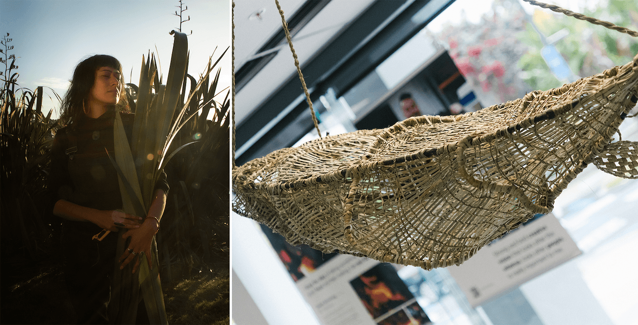 Ahi Nyx (Te Āti Awa me Ngāti Raukawa), a raranga artist, created four types of kono to hold and display items for sale at Konei, alongside a hinaki, or eel trap, woven with harakeke from Udy’s hometown of Rotorua. Nyx says the opportunity to contribute to the store was her way of helping to re-indigenise the space for everyone who might visit or use it.
