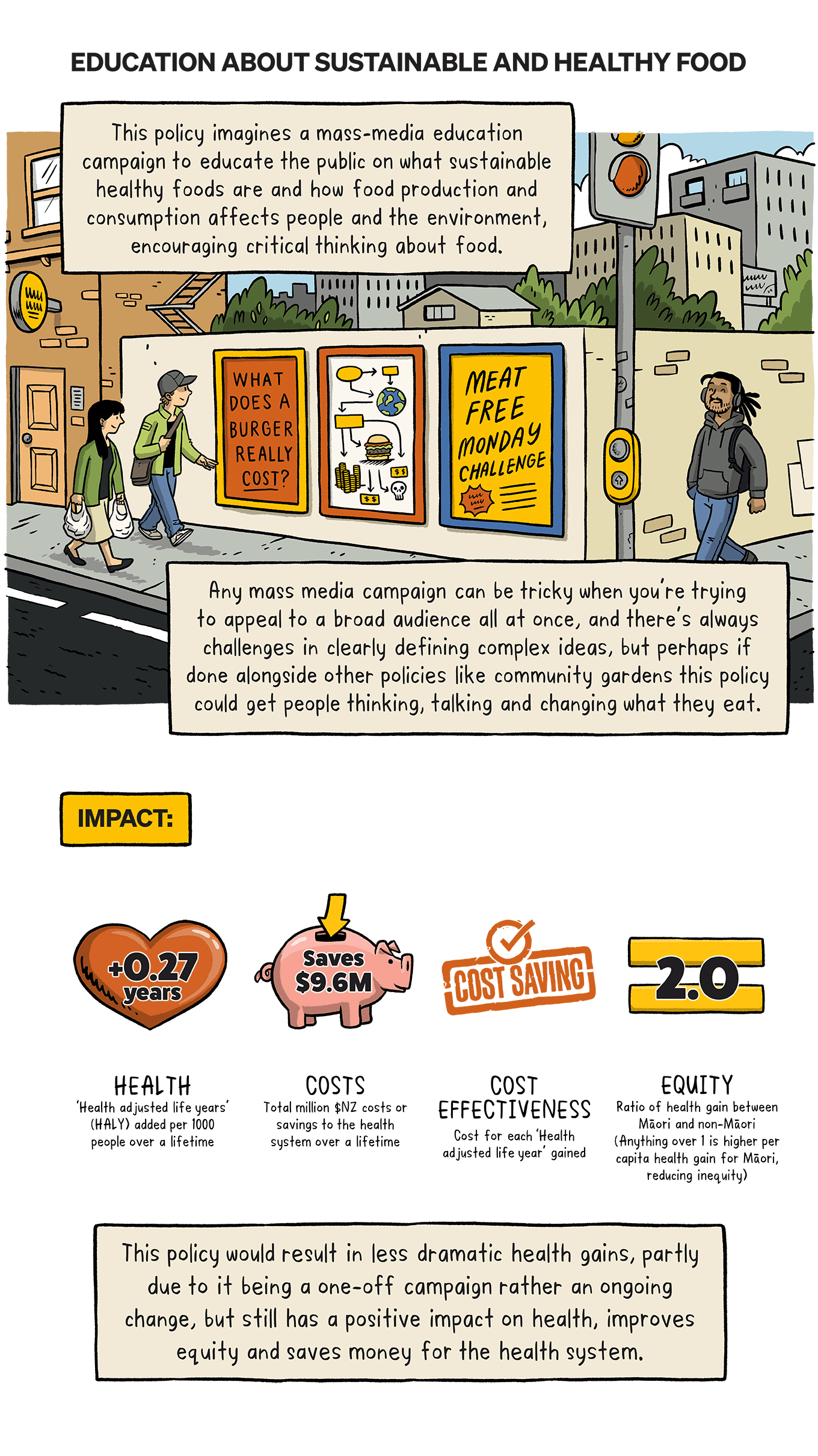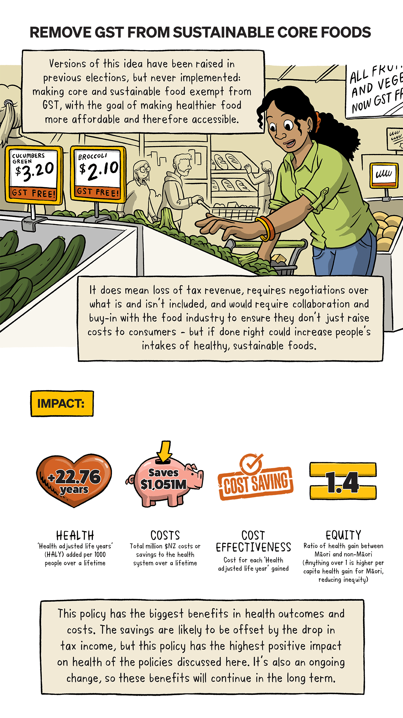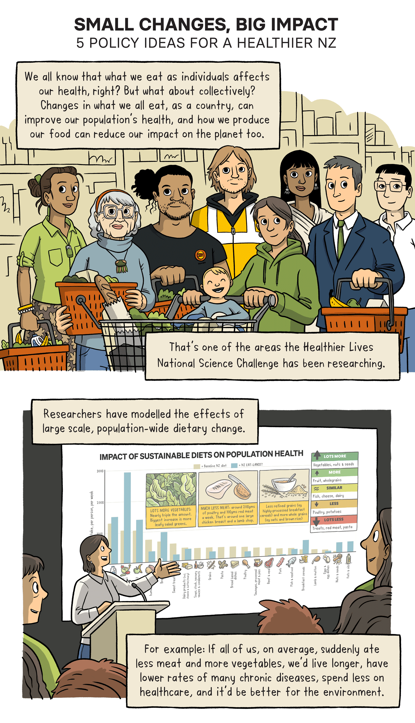 How could a sustainable diet impact your health? What would the impact be on the planet if lots of us made that shift? Dr Cristina Cleghorn (University of Otago) has been investigating the impact of sustainable diets on health and the effects of population-wide dietary change for the Healthier Lives National Science Challenge. This comic details the research, five policy ideas that came out of it, and the impact those policies could have.