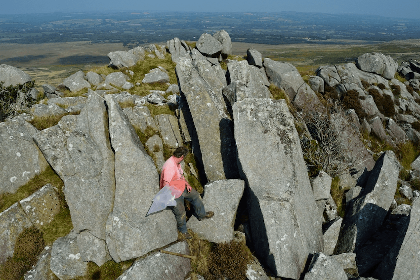 So where I’m standing in this photo [above] at Carn Goedog there’s one, two, three pillars that are missing. I’m standing at the foot of where they would have been pulled out. And at the other quarry, Craig Rhos-y-felin, the geologists could actually say exactly which pillar had gone to Stonehenge because they found out that the microstructure of the rhyolite varied across the face of the quarry. There is one pillar that next to it has still got the stone wedges used to lever them out. They were going to remove that one and gave up.