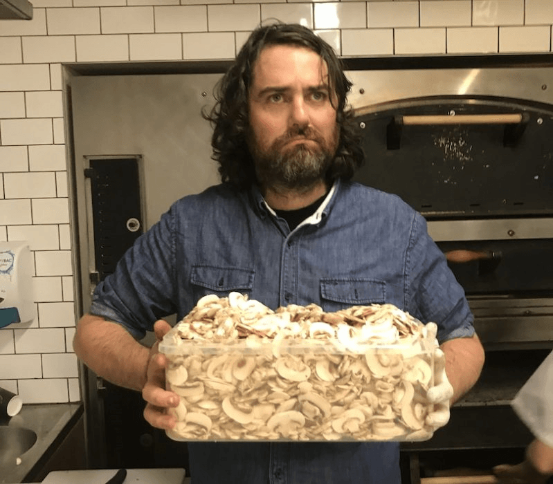 I foolishly suggest that we could conduct the interview while working and that I’ll happily do whatever food prep he needs doing. So here I am, slicing up the biggest pile of mushrooms I have ever seen. The energy of the kitchen is electric. Tommy, who has just finished a shift cooking chicken next door, after doing prep all morning, is organising shift cover for tomorrow on his phone and making pizza after pizza.