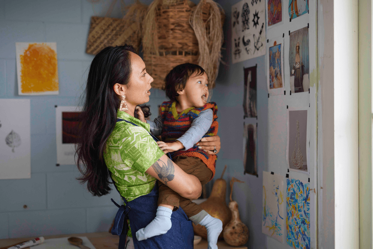 I try to, as much as I can, like, take their babies off their hands so they can focus on creating. Or some weeks it’s for the babies, so we’ll set up activities and create with them. That’s part of the philosophy, that having our babies around those creative environments to build their creativity, to build their thinking and how they’re brought up in the world, having them in those environments to uplift their mana and tapu.