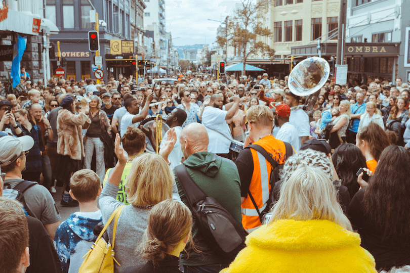 The festival is an intricately curated two days of chaos that unfolds on the street. In 2016, the festival created a horn war, a good-natured brass-off, when 76 trombonists – half from classical schooling, the other half jazz trained –marched down Cuba St, one group from each end, to challenge each other in the “Battle of the Bones”. When they met in the middle they jammed together on a piece of music composed especially for the festival. The next year was the “Battle of the Saxes”. This year’s fanfare “Blow Your Own Horn” will see a giant group of trumpeters perform a bespoke piece by legendary Wellington trumpeter Mike Taylor.