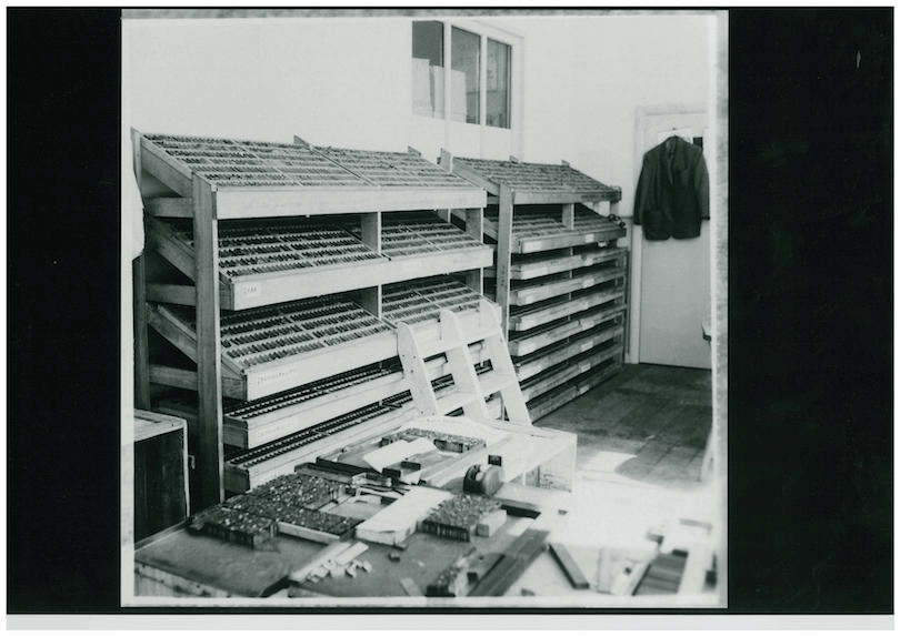 The Growers’ Journal reflected a burgeoning Chinese community that was well and truly acclimatising. As its distribution grew, it began to include some articles and advertisements in English. And at Wai-te-ata, Ya-Wen showed me photographs of the rooms used for typesetting, pointing out that they mixed the Western tradition of storing type in cabinets with the angled, open trays that she’d observed at printers in Taiwan and Hong Kong.