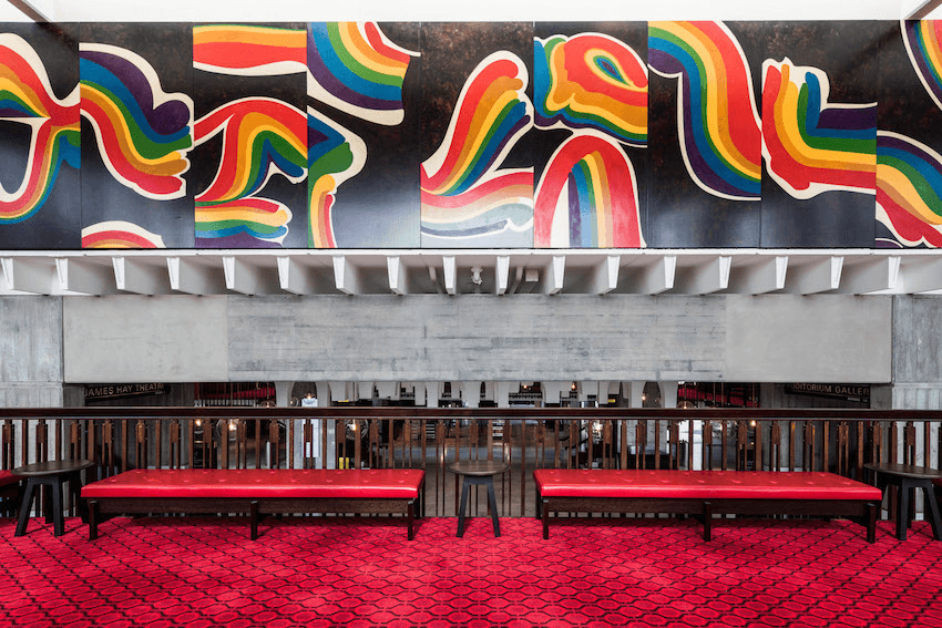 Designing contrasting architectural experiences within one building is key to Warren and Mahoney’s work, and in the Town Hall this is not just provided by the materials. For example, the sense of compression at the main entrance, where doorways are low, contrasts with and emphasises the vast openness of the interior volume of the auditorium. The clarity of the plan and form of the building, and of the circulation from the foyer into the main performance spaces, contrasts with the layered visual complexity of the mezzanine floors and walkways suspended over and around the foyer. And the riotous colour and joy of Pat Hanly’s commissioned painting Rainbow Pieces, visible through the windows, is heightened by the muted grey, brown, pink and blue tones of the exposed concrete that flanks the exterior of the foyer.