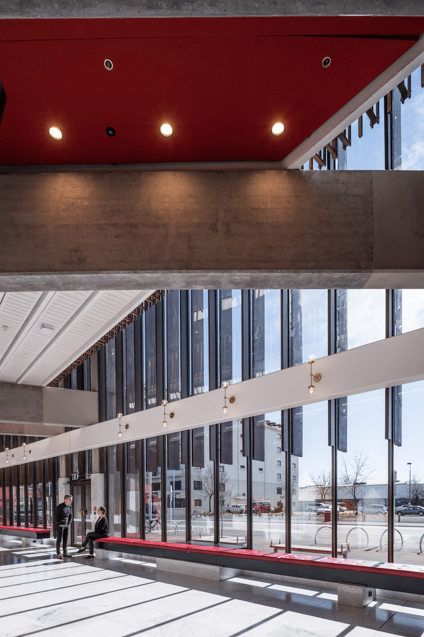 It’s this bloody-minded, relentless use of concrete that seems to irritate the building’s critics. But the concrete finishes have their own visual interest and reward the patient and repeat observer with unexpected delight. There are a wider range of colours on the exterior aggregate than the word “grey” conveys. Here you’ll find not just mid and dark greys, but also reddish and brown tones that change with the light and the seasons. On a spring morning from across the Ōtākaro Avon River, the aggregate on the south side of the building is a warm, dark pink, while in the afternoon it takes on cool, blue tones.