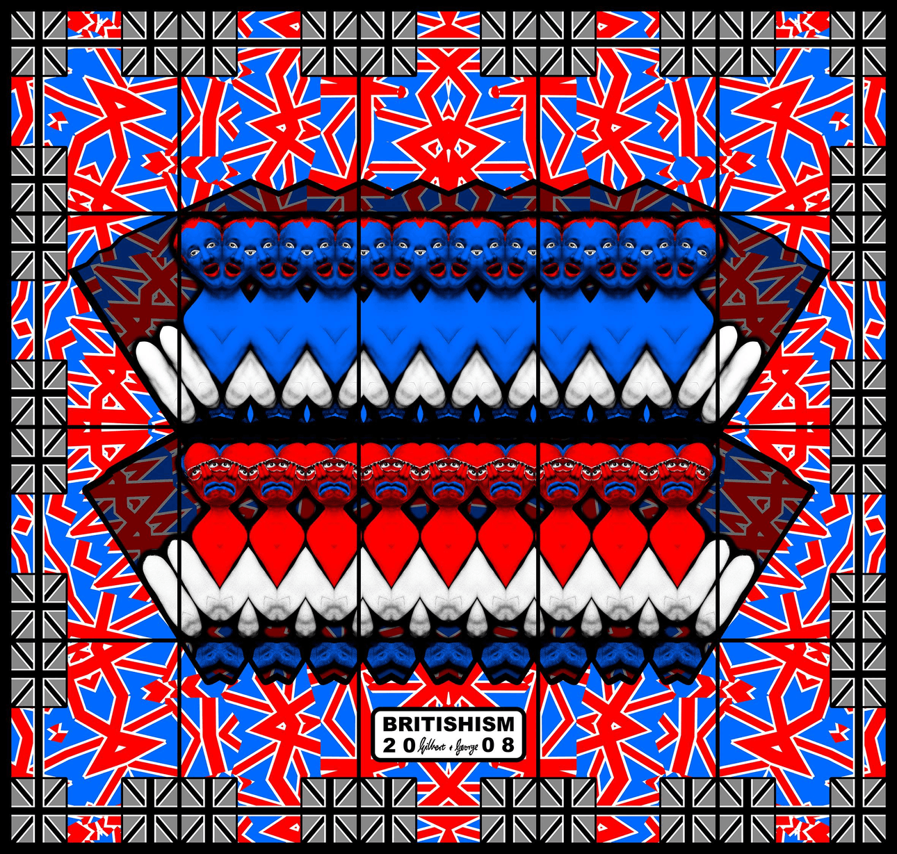 It’s difficult to ignore this sentiment. Everything is terrifying in the Jack Freak Pictures, which take the blue, red, and white of the Union Jack and hack it to bits. “Britishism” (2008) has the graphically busy and exciting quality of a death metal album cover. And the Union Jack here has been separated, shattered, and rotated so that if it still operates within the language of flags it is only because these new shapes have an echo of swastikas or anarchy symbols. The figures of Gilbert & George in this picture are blue and red. They are small and multiplied in such a way that their miniatures look like rows of teeth revealed by a mouth that is, what – yawning? Crying? Screaming? We’re getting beyond creepy here.