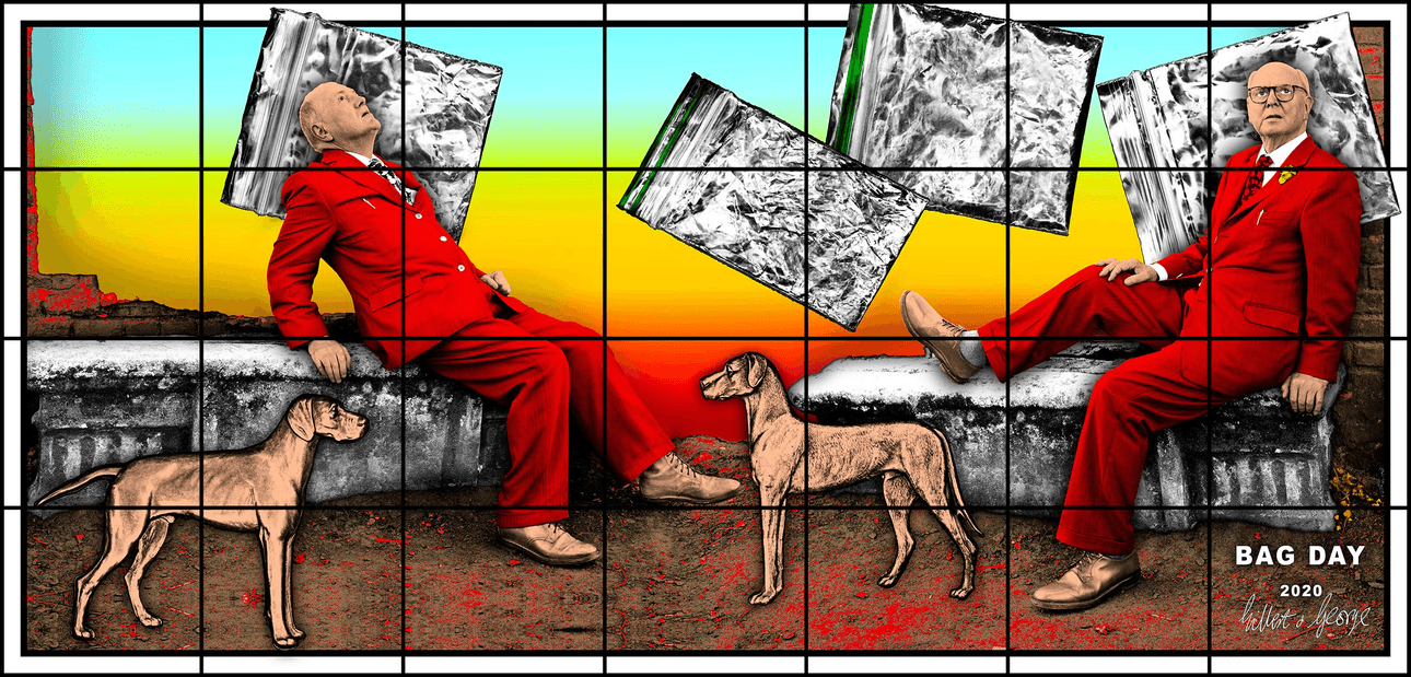 None of the figures in the New Normal Pictures of 2020 are dancing. Instead Gilbert & George appear as if they are being buffeted by invisible, menacing forces. On those same East London streets, they are struggling to remain standing, and in some pictures they have even failed, collapsing in the likes of a bus shelter. “Bag Day” (2020) has them decked out in pressed red suits, plonked down on what look like the blank bases for a couple of torn-down statues. Crumpled plastic zip-lock bags hover in front of a nuclear sunset. A pair of skinny looking dogs look left and right, as Gilbert & George look skywards. What do they hope to find up there? Except for the dogs, the unsettling factor here is low. The tone is more of devastation, exhaustion, maybe disbelief? Whichever, it hurts a bit to look at.