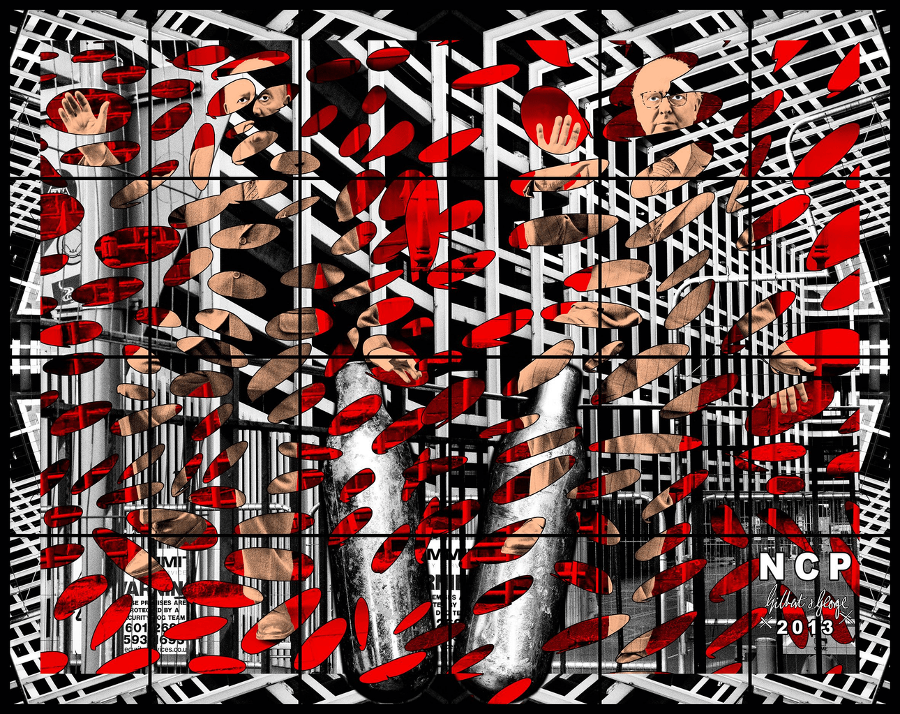 The Scapegoating Pictures present monochromes of Gilbert & George’s East London streets. The hard asphalt and metal of the scenes are softened by the fuzzy lines of spray paint that both reveal and reduce the flesh-tone figures of Gilbert & George. In these works they shimmer, and occasionally dance, while being rained down on by nitrous oxide canisters. “NCP” (2013) has them trapped inside a matrix of metal scaffolding. Their bodies are revealed only through floating Microsoft Paint-like lassos. Around them fly similarly shaped windows (vortexes, holes?) revealing another background in their favourite blood-red. They are dancing in this picture, but reluctantly – as if someone off-screen might be pointing a gun at them.