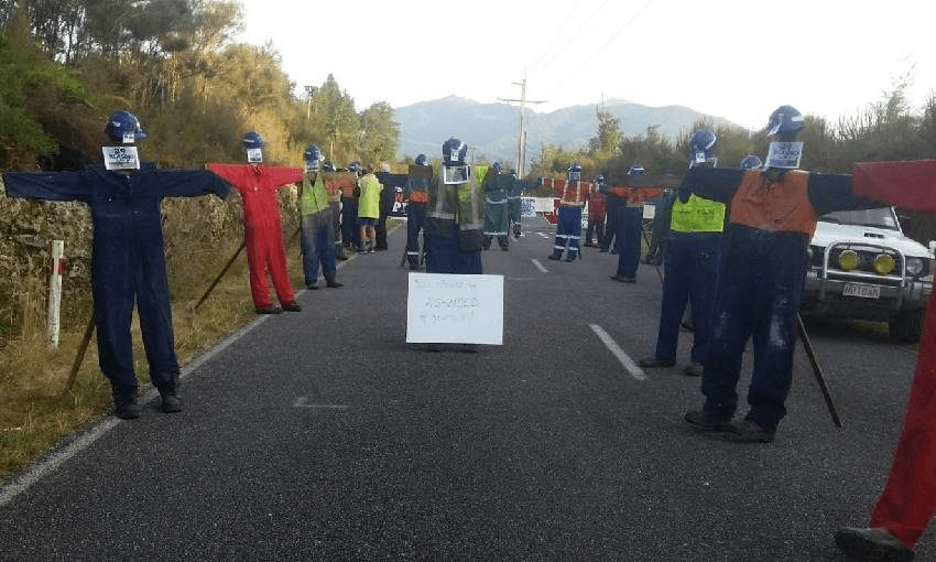 In Greymouth, 29 effigies kitted out in mining gear were lined up outside the entrance to the Pike River mine, an eerie and effective means of preventing Solid Energy from continuing their work there.