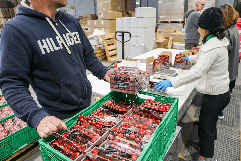 They’re picked by hand. Different growers do it different ways but the way we do it is that our pickers are very selective. They’ll pick the cherry by the stem and then singulate them (cherries grow in bunches, so they’ll actually separate the cherries). Once they go in the picking bucket, they’re not touched again by human hands as we have an automated packhouse. Almost everything for the domestic market goes into a prepacked 400, 700 or 900-gram punnets or gift boxes.