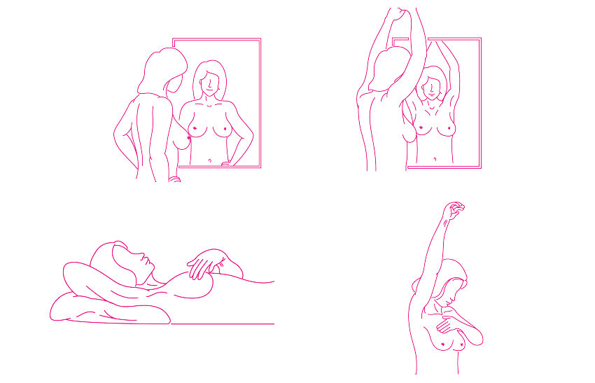 Getting to know your normal can be achieved in three steps, Terry tells me: touch, look and check. Or TLC, if you aren’t a scrub. Touch is the first step and can be done either lying down in bed or in the shower. “Put one arm up and use the other arm to touch – you want to make the surface area of the breast as big as possible, and you are using the pads of your fingers to feel for any lumps from underneath your collar bone to all the way around and underneath your armpit.”